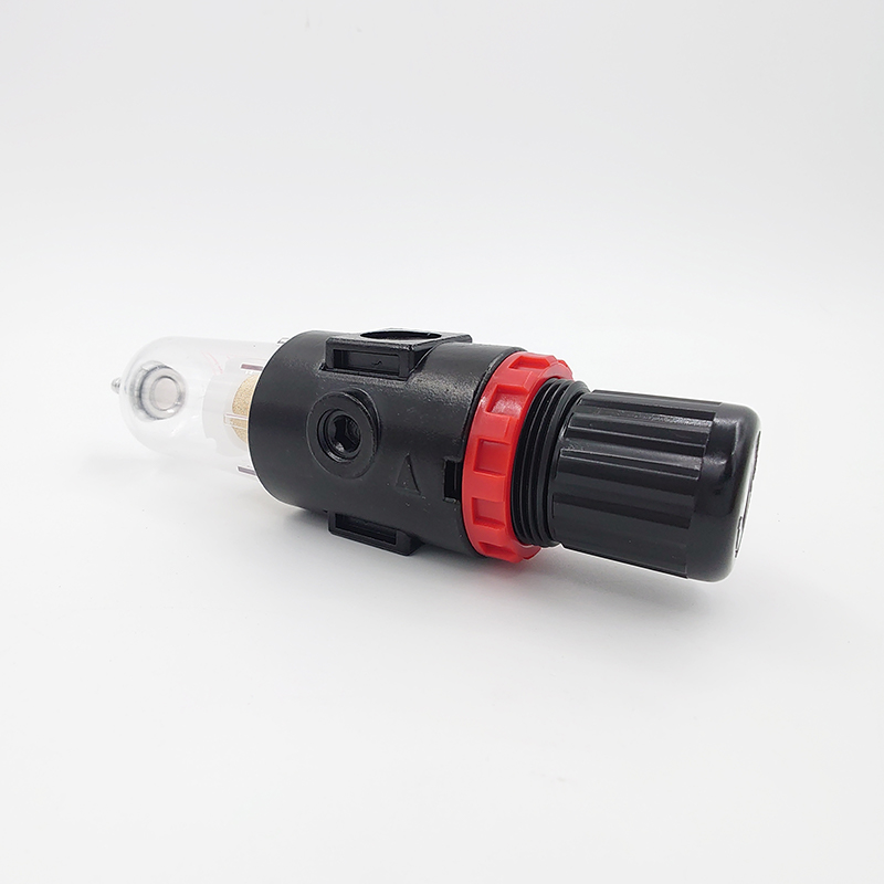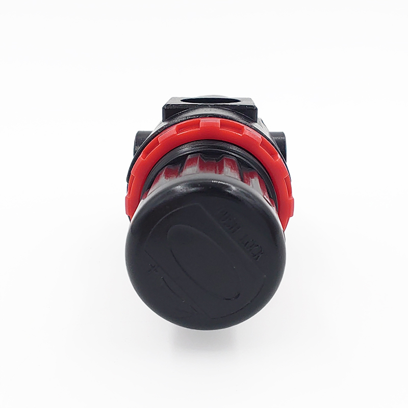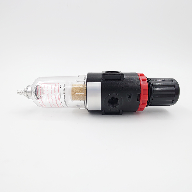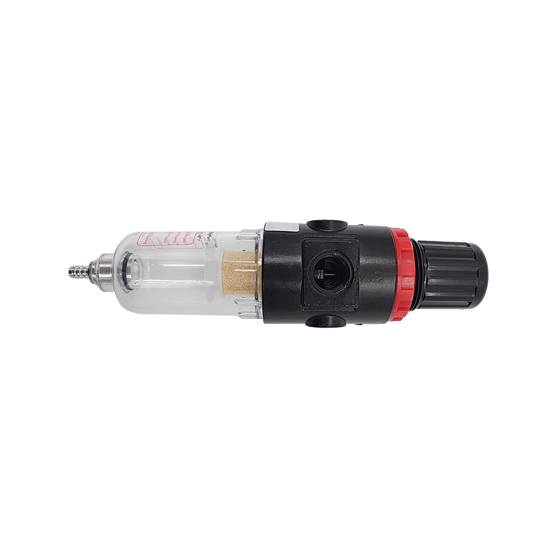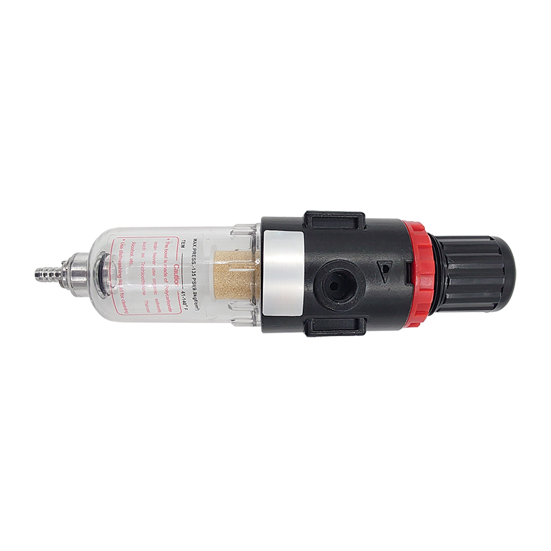 1.Adjustable pressure control knob locks desired setting in place 2.Allows the precise delivery of clean, dry air 3.Internal diaphragm regulates airflow 4.Spring-loaded catch bowl for easy drainage 5.Rated up to 150 PSI 6.Regulator body features a 1/4″ female inlet and outlet 7.Clear inlet and outlet markings for simplified installation